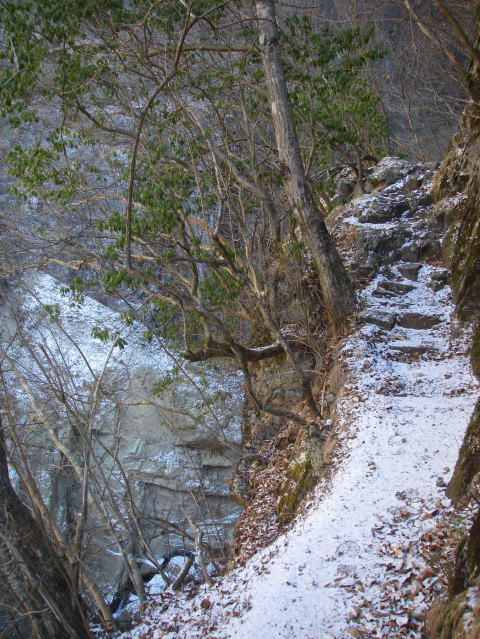 万が一バランスを崩しても、谷には転落しないように細心の注意を払います。