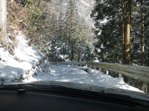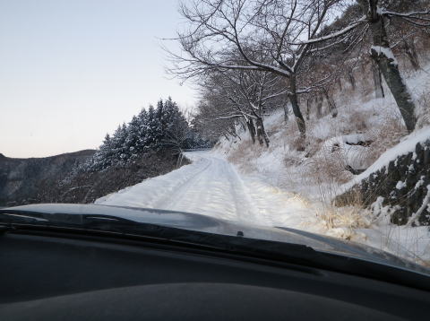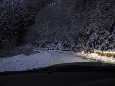 高速を下りて、標高を上げると雪が路面を覆い出した…。