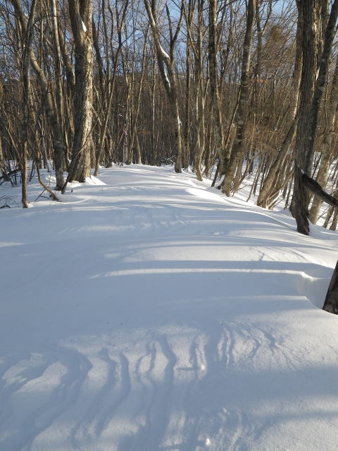 尾根歩きから斜面歩きに移行して、スズタケが出てきて、吹き溜まりが無くなりホッ…。